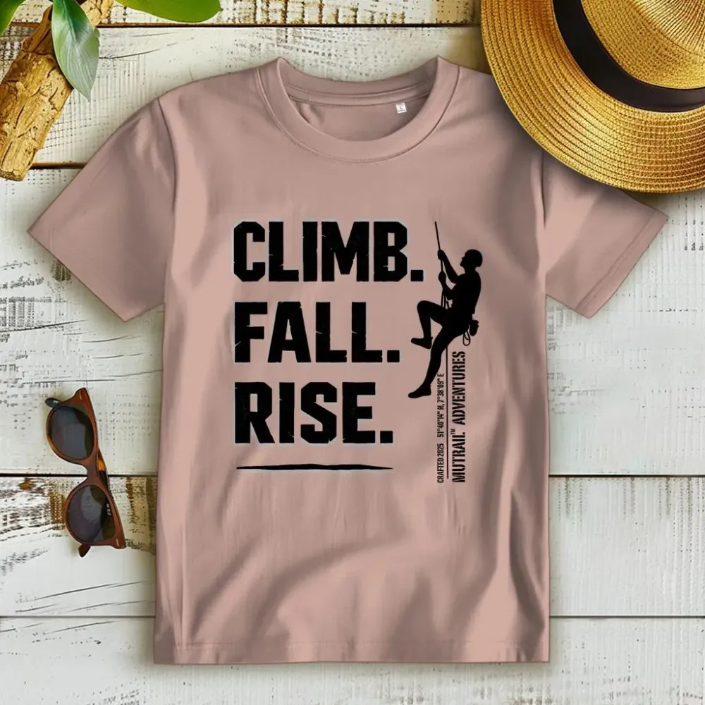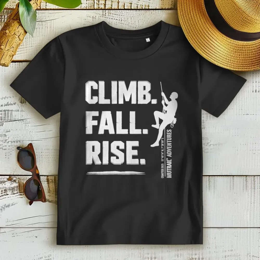Erobere den Fels mit unserem Premium Bio T-Shirt "Climb & Fall". Dieses Design fängt die Essenz des Klettersports ein: Fallen, Aufstehen und Weiterklettern. Perfekt für die Kletterhalle oder den nächsten Outdoor-Trip.